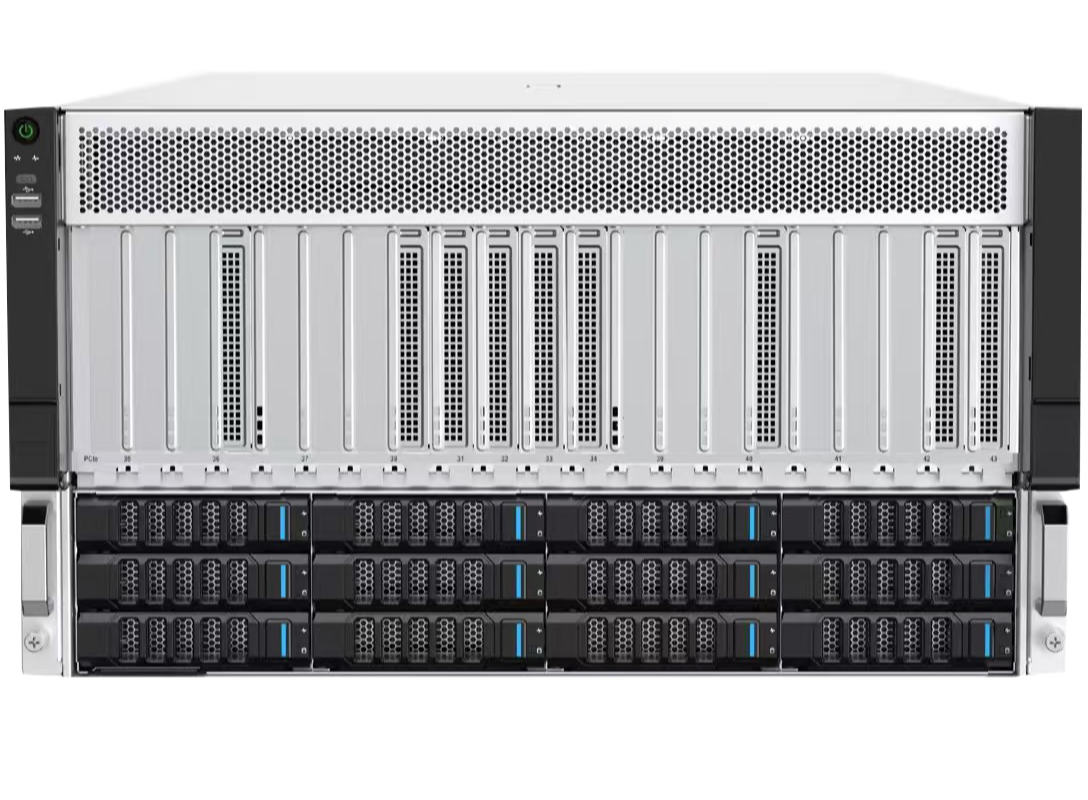 JK-ASU24I,支持2颗英特尔®至强®第四代或第五代可扩展处理器,配合8通道5600MT/sDDR5内存技术,为用户提供高达50%的带宽提升。通过27个PCIe5.0插槽和多达12个硬盘插槽的支持,实现灵活的扩展能力。96%的电源能效,以及0℃~35℃的标准工作温度设计,为用户提供更高的能效回报。
