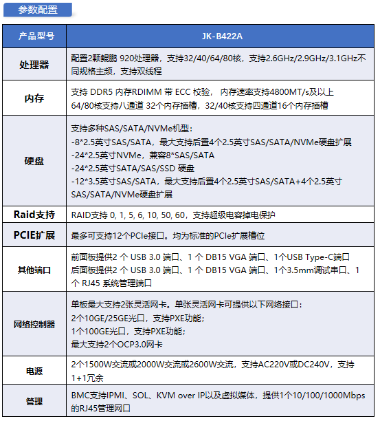 JK-BU422A 鲲鹏 920 2U 双路服务器,依托国产化核心平台打造,提供企业级多核高并发计算性能与灵活扩展能力,支持同构部署、实现零性能损耗,完美适配移动应用云化需求。产品适用于对信息安全要求较高的云计算、大数据、分布式存储、ARM 原生应用、高性能计算及数据库等核心场景,兼顾多样性计算与绿色计算双重需求,高效承载海量数据处理任务,为国产化 IT 基础设施提供稳定、安全、高效的算力支撑。